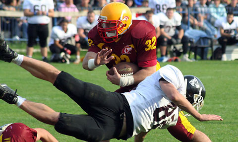 Coming into the game after an easy win in Vienna for the Vikings and a shaky victory against the bottom of the league team Traun for the Wolves not many people had seen this one coming. The Wolves offense came out firing on all cylinders, scoring on every opportunity they had except for the first drive that ended with an interception. QB Vasyl Yordan completed passes to six receivers, three for touchdowns (Piros, Király) and ran for a score himself. The defense had stopped the Vikings once by forcing a punt and once by intercepting (John Trikkas again) QB Philipp Jobstamann and that proved to be just enough. The Wolves RB duo of Péter Cseperkáló and István Demeter punished the undersized Austrian defense for serious yardage, with the latter running for two touchdowns utilizing the great blocks set by the FB and the offensive line. Last year’s Wolves TD leader Krisztián Piros also scored twice, the second time avoiding numerous tackles and racing 60 yards to the endzone. The Vikings lost for the first time in an official game in almost three years, with their unbeaten streak coming to an end at 24.