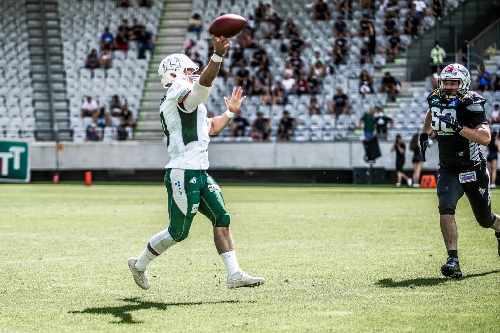 Sean Shelton completed 29 of 37 passes for 237 yard and a touchdown. Adrian Platzgummer collected 11 catches for 92 yards and Marco Schneider added 5 of his own which were good for 44 yards and a touchdown. Romed Zangerle rushed 15 times for 60 yards, and Ruben Seeber had 2 carries for 6 yards, and was stopped once by the end zone for a score. Raiders’ defense broke up 4 passes, which ended up being 1 less than they needed to triumph. Jan Mayerhofer picked up an interception.