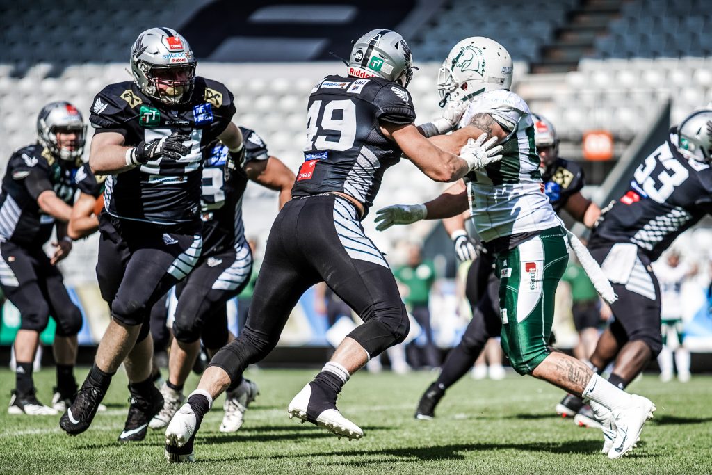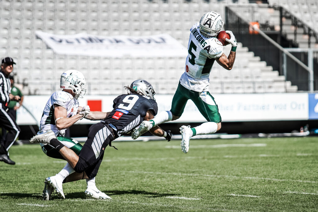 Alexander Haupert posted excellent numbers with 12 of 23 for 3 touchdowns and an interception. His longest pass was a 98 yard score and the target was Tyler Rutenbeck who grabbed just 1 more pass which also went for a 15 yard touchdown. He was named the MVP of the game because his production was instrumental in the Unicorns’ win. Moritz Böhringer had 7 catches for 123 yards, a touchdown and again a 2 point conversion. The defense stepped up with 4 sacks and a forced fumble but no recovery.